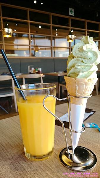 最後正餐吃完當然要來份甜點,不過甜點和飲料部份是沒有包含在套餐內,須要另加60元,所以就只有我點了柳橙汁和抹茶冰淇淋。