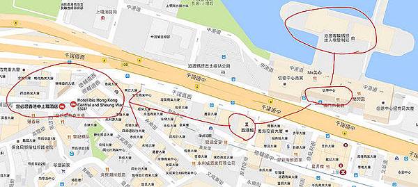 ↑上圖:從港澳碼頭往宜必思的路徑圖 (資料來源:google地圖)