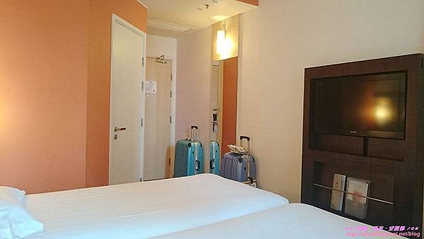 床鋪是兩張單人床合併在一起,非常節省空間,和電視之間的距離僅能容納一個人通過。