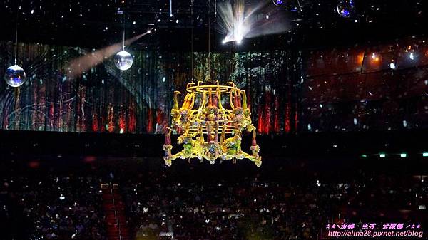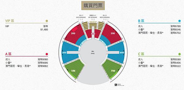 座位區大致分成A、B、C及VIP區四區塊,由最靠近舞台的A排往上延伸分成A到O排。我們所坐的位置在C區O排,也就是面對整個舞台的左側最上方,場地依據座位等級的不同,依照官網上的標示,成人的票價從港幣580元到980元,小孩則是港幣406元到686元,還有不分大人小孩,均一價每位港幣1480元的VIP席。