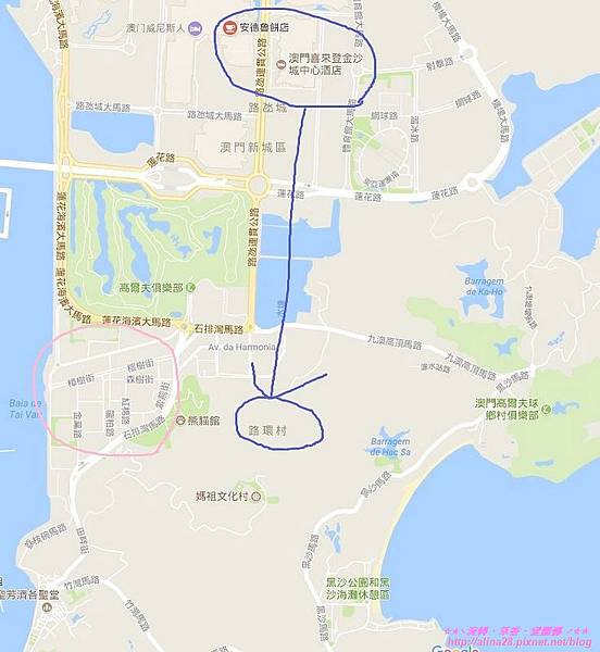路環是整個澳門島嶼中最南邊的地方,整個澳門由本島、路氹以及路環所組成,最熱鬧的要算是路氹,很多熱鬧的五星級飯店比如威尼斯人、銀河、新濠酒店還有國際機場都在此處,我們此行住宿的金沙城喜來登也位於此。